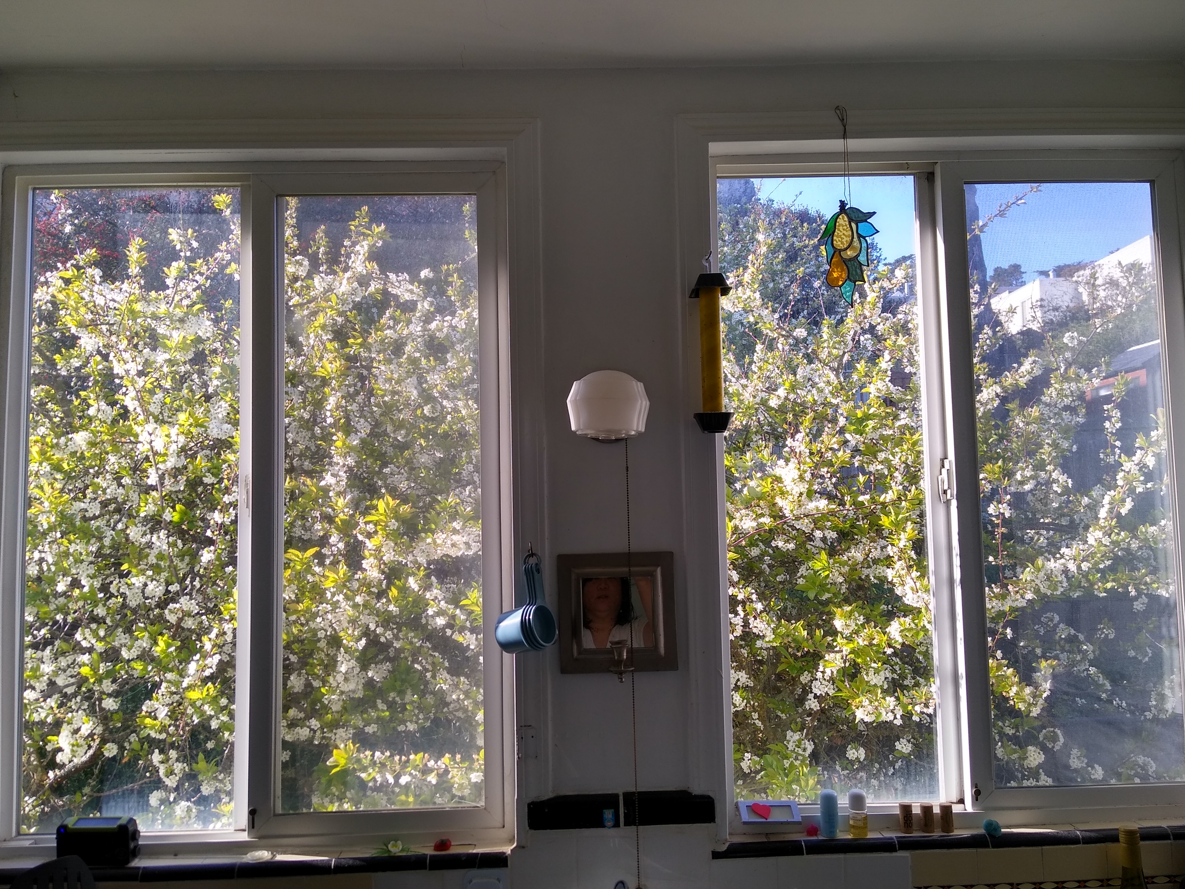 This was what my kitchen looked like last month, with the fruit trees outside in the terraced back yard pressing in at the window. Things are greener now. The cedar waxwings are taking their last bites at the red berries on the toyon before flying off to parts north. I just wish it was less windy!