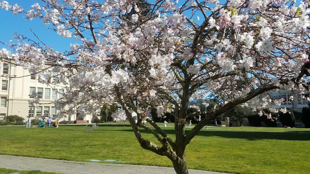 [Image is of a flowering cherry tree on the USF campus that I found on Yelp, taken around the time of the trip.]